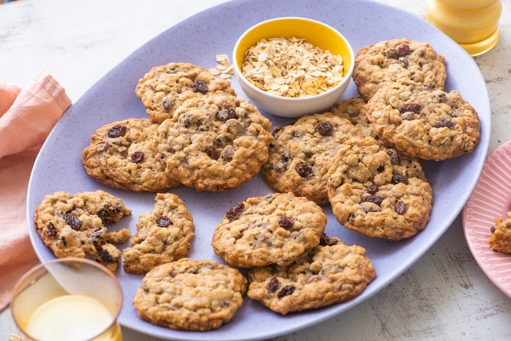 0 Preheat oven to 350 F. 1 Place the butter and sugar in a bowl or standing mixer and beat for 3-5 minutes on medium high or until light and fluffy. 2 Add the egg and vanilla extract and beat for another minute on medium speed or until completely combined. 3 In a separate bowl, mix to combine the flour, oats, baking soda, salt and cinnamon. 4 Slowly add the dry ingredients into the wet and mix to incorporate. 5 Stir in the raisins then using a 1 tbsp mini ice cream scooper or spoon place on a silat or parchment lined cookie sheet. 6 Bake for 12-14 minutes for chewier cookies or 15-17 minutes for more crisp cookies. 7 Cool on baking sheet. View original recipe